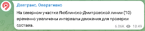 Привет. Вы на канале Хома-Хома про метро. В этой статье вы узнаете про сбой на ЛДЛ. Вечером , в 18:49 Дептранс сообщает что на северном участке ЛДЛ увеличены интервалы для проверки состава. На северном участке Люблинско-Дмитровской линии (10) временно увеличены интервалы движения для проверки состава. На станции „Верхние Лихоборы“ пять поездов пассажиров выпускали. Сейчас поезд стоит с пассажирами 15 минут. Ну на станции тогда будет транспортный колапс. С 18:30 не могу уехать с „Бутырской“ в сторону „Марьиной Рощи“. Проехало два поезда, из которых высадили пассажиров. И один еще стоял. Минимум полчаса движения поездов не было. Люди стали выходить из стоящего вагона. В 19:00 поехала другим транспортом-. сообщают отчевидцы В 19:32 движение в графике. Причина сбоя - всё теже старые поезда, которые не могут заменить. А на этом всё. Статья завершина . Пока друзья .
