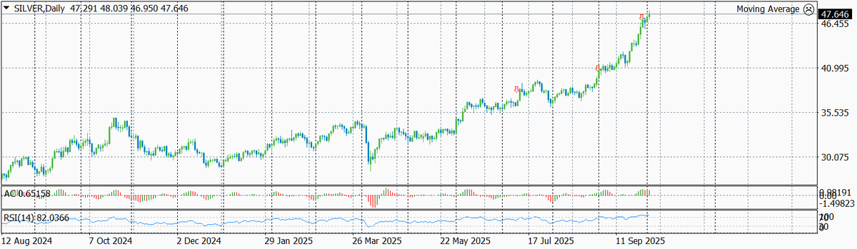 В дополнение к ранее открытым позициям по золоту и серебру от 14.07.2025, 08.09.2025 усиливаем шорт по серебру от текущего уровня 47,6 с пятым плечом, и шорт по золоту от текущего уровня 3884 с пятым плечом.