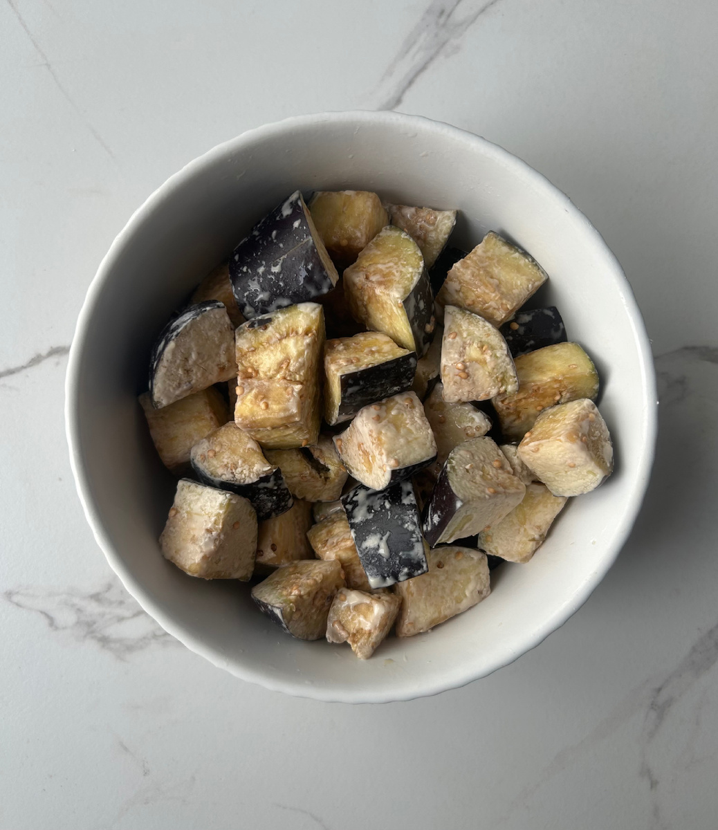 Баклажан нарезать крупными кубиками. Поместить в отдельную емкость,посолить и оставить на 5 минут.Далее слить выделившуюся жидкость,обсушить баклажаны . Кусочки баклажанов обвалять в крахмале и обжарить в сотейнике с растительным маслом до золотистой корочки.