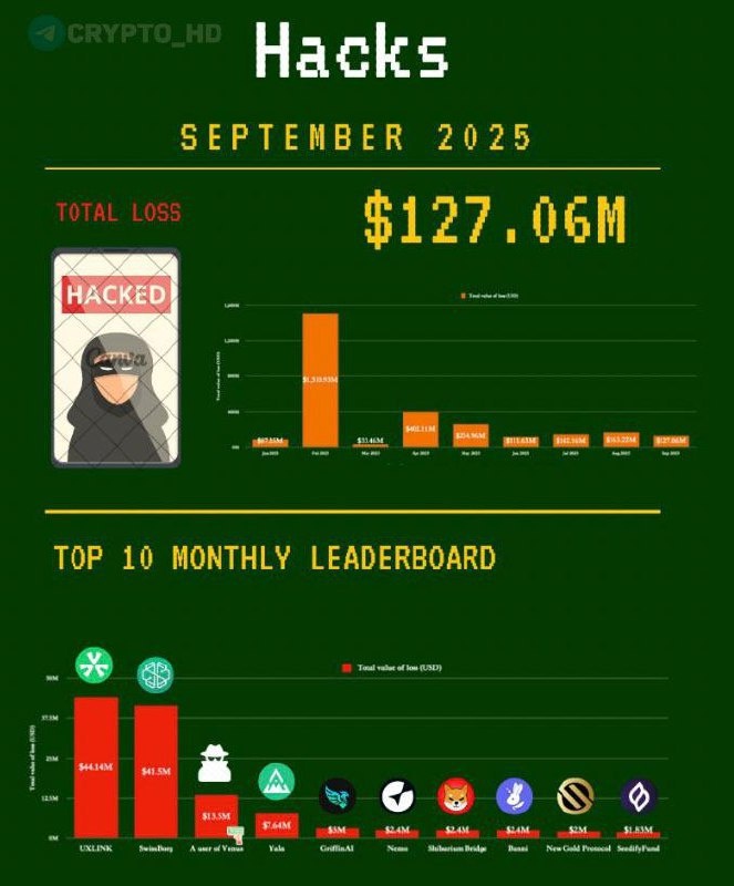 🏴 По данным PeckShield, в сентябре хакеры украли криптовалют на $127 млн
