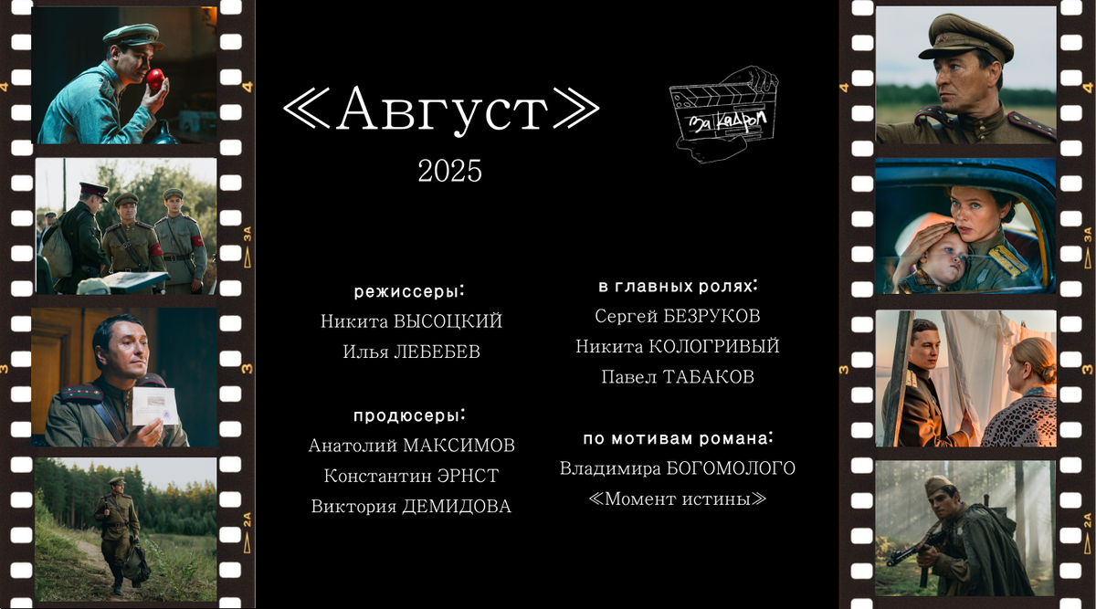 Премьера фильма «Август», по мотивам романа Владимира Богомолова «В августе сорок четвертого» («Момент истины»), в кинотеатрах страны состоялась 25 сентября. Работа над проектом началась еще в 2018 году при поддержке российского Фонда кино. Создатели отмечают, что на протяжении всего процесса производства старались максимально приблизиться к оригиналу, не исказив смысла произведения. Продюсерами фильма стали Анатолий Максимов и Константин Эрнст, режиссерами – Никита Высоцкий и Илья Лебедев.