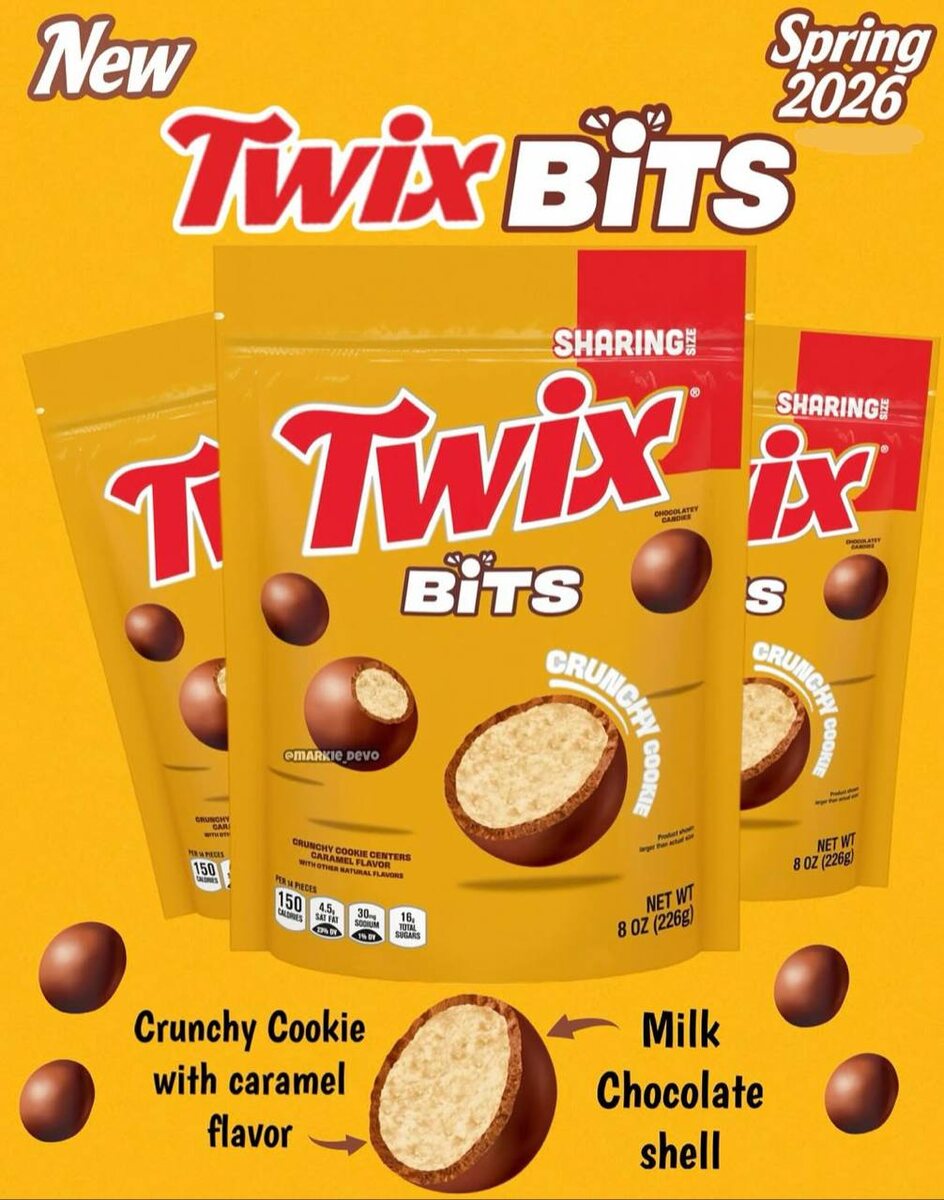 О, у Twix выйдет новинка Bits — это хрустящие шарики с карамельным вкусом в шоколадной глазури. На полках магазинов сене должен появится весной 2026 года. Ждем у нас🍫