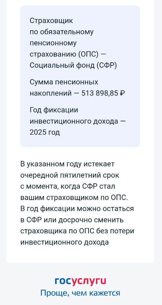В законе прописано, что страховщика по ОПС лучше менять раз в 5 лет, чтобы делать это без потери дохода. То есть раз в 5 с того момента как я получила страховщика, происходит фиксация, можно сменить его и не потерять доход, если менять страховую в другой год, то инвестиционный доход за какой-то период времени будет утерян. И тут я хочу показать картинку с сайте СФР, она поясняет все лучше любых слов. Правда картинка старая, 2019 года, но суть не меняется. Прям Юрьев день напоминает. И страховщик - это в данном случае либо Социальный фонд России (СФР), либо негосударственный пенсионный фонд (НПФ). То есть уйти от любого помещика просто так не получится.