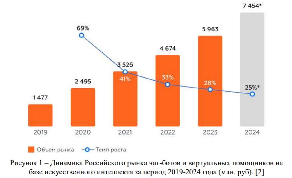 Активное внедрение искусственного интеллекта (ИИ) в общественные сферы стало определяющим трендом последних лет. Стоит отметить, что проникновение ИИ в разные области происходило неравномерно: если в образовании его массовое применение началось относительно недавно, то в бизнес-среде технологии ИИ, пусть и в более упрощенной форме, использовались значительно раньше. Источник: https://www.elibrary.ru/download/elibrary_80285947_60517556.pdf Как наглядно демонстрирует статистика (см. рис. 1), объём рынка ИИ для бизнеса демонстрирует стремительный рост, увеличившись на 5977 млн рублей за последние 6 лет [1]. Это объясняется высокой эффективностью его применения: например, внедрение чат-ботов и автоматизированных систем позволяет значительно снизить нагрузку на сотрудников поддержки и колл-центров, оптимизируя затраты и ускоряя обработку запросов. Что же касается простого пользователя, то для него ключевым преимуществом нейросетей стала возможность получить моментальный результат относител