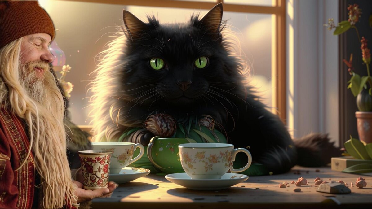 С тех самых пор как Окомир привез из дальних странствий странные, горькие, зеленые зерна, а потом обжарил, смолол в странной жужжалке, и сварил в маленьком ковшичке, с очень, очень странным названием, джезва, а то и турка (жена турка что ли названия давала? Или в честь жены тура назвали? Аль турнули кого?) в Избушке пристрастились к кофею. И как Окомир не пытался привить правильное название, кофе, значится, так оно почему-то было уютней. А уж когда коварный Окомир заваривал его по утрам, просыпались все! Как можно спать, когда твои ноздри щекочет такой дивный аромат?! Но пили его не только по утрам, но и так, под настроение. - Друг мой Баюнушко, - в отношениях Баюна и Домового наступило мирное время, и они обращались друг к дружке исключительно ласково уважительно, - а не испить ли нам с тобой ентого чудного кофею? – позвал Баюна Домовой. - А чего ж не испить? – лениво потянулся Кот, - только ты завариваешь, у меня же лапки, сам понимаешь! - Канеш, канеш! – закивал бородой Домовеюшка,
