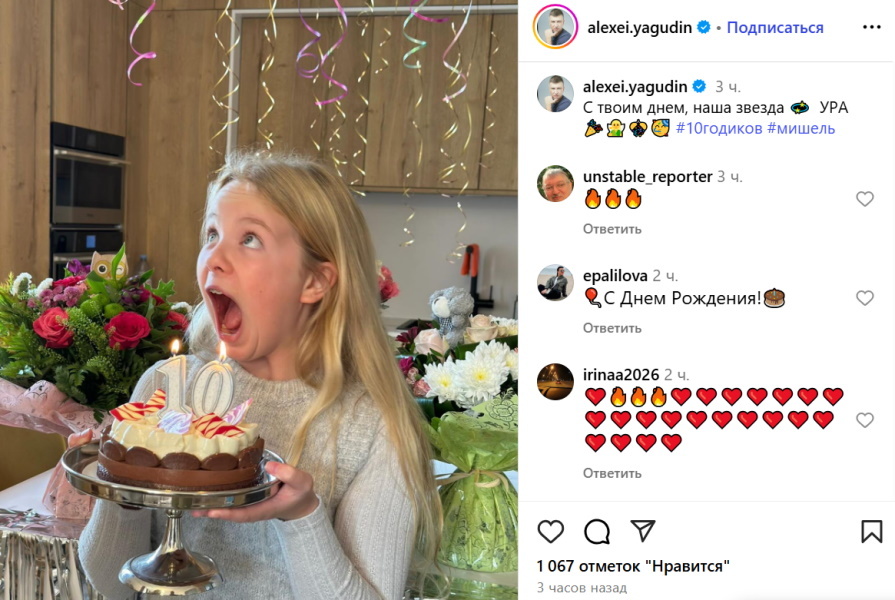 Олимпийские чемпионы узаконили отношения уже после рождения детей. Все произошло на гастролях в Красноярске зимой 2016 года. Как потом признавался фигурист, идея «поставить штамп в паспорте» возникла спонтанно. На неожиданное предложение возлюбленного Татьяна Тотьмянина тогда ответила радостным согласием. Сегодня звездные супруги отмечают первый юбилей своей младшей дочери Мишель. По этому случаю в личном микроблоге Алексея Ягудина появилось атмосферное фото с 10-летней именинницей. Снимок получился забавным и живым благодаря милой рожице, которую скорчила счастливая девочка. «С твоим днем, наша звезда. Ура!» - обратился Ягудин к наследнице. Мишель Ягудина