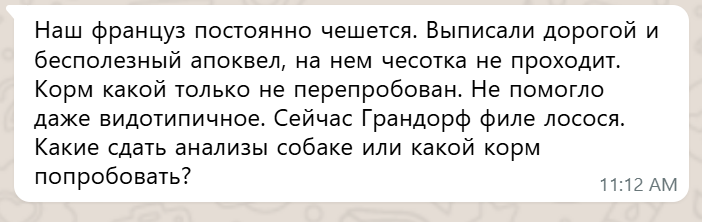 Какие-то советы в условиях столь ограниченных исходных данных можно дать только в отношении выделения основных направлений дальнейших действий. Апоквел-то был выписан, но возникает вопрос, а есть ли диагноз? Пройден полноценный протокол диагностики и лечения зуда? 1. Первично мы исключаем паразитозы диагностическими процедурами (соскобами) и пробными обработками от паразитов курсом, иногда комбинируя сразу и таблетки, и капли на холку, и ошейники. Обработки проводятся 3 раза с интервалом 3 недели, поскольку мы также первично исключаем гиперчувствительность к укусам паразитов (блошиный аллергический дерматит). 2. Параллельно проводится цитологическое исследование (а иногда и посев на грибковые культуры) для исключения грибкового перероста и пиодермии, которая лечится внешними обработками и/или системной антибиотикотерапией. 3. Всё исключили? Тогда переходим к элиминационной диете - строгой диете на гидролизате белка в корме или абсолютно новом белке для собаки в домашнем рационе (наприм