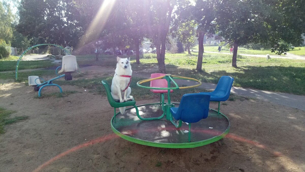 В этот момент из ниоткуда внезапно возник мягкий порыв ветра. Он раскрутил карусели — и Лена увидела, что на одном из сидений катается... игрушечная собачка! Лена стояла и смотрела, как заворожённая.