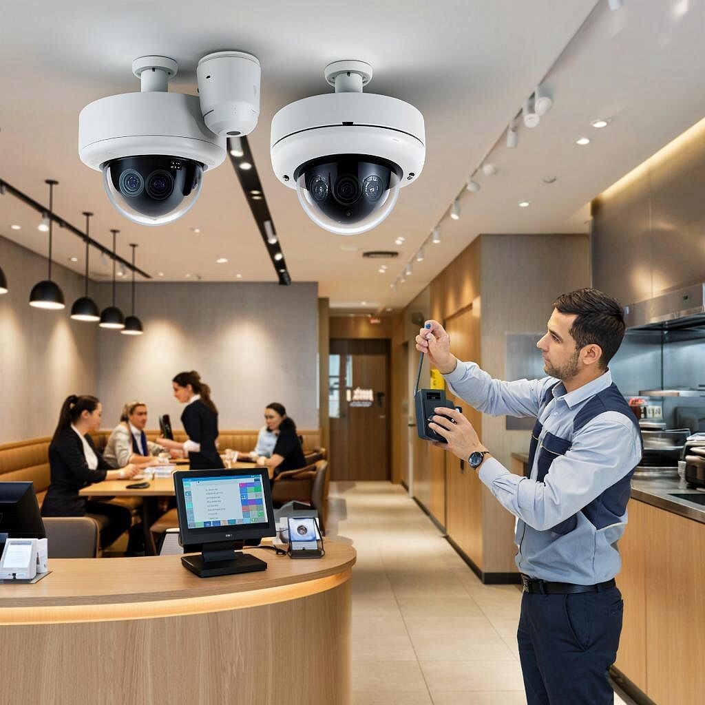 клиентами. Сначала оцените задачи: охрана, учет посетителей, контроль кухни — для каждой нужен свой тип камеры и зона обзора.