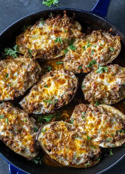 Эти лодочки из баклажанов до краёв наполнены мясным соусом и расплавленной моцареллой. Если вы никогда не пробовали фаршированные баклажаны, то обязательно попробуйте их приготовить. Расплавленный сыр сверху придаёт блюду изысканность. Готовится это блюдо очень просто.