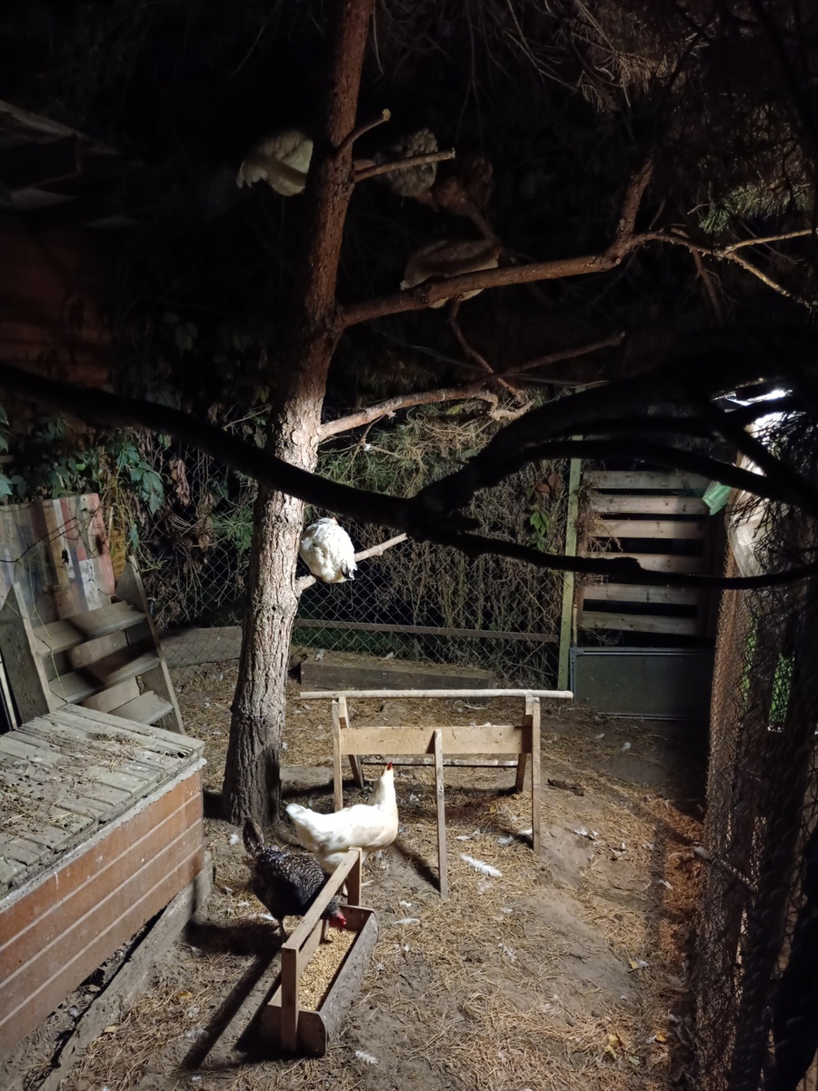 Кокошкам «Попугаям» сделал освещение. Подключил в общую автоматику. Которая работает уже годами. Включается за полчаса до заката и держится до десяти вечера. Утром в четыре подъём. А то они уже к ужину все спят, в шесть вечера у них тут темно. Непорядок.