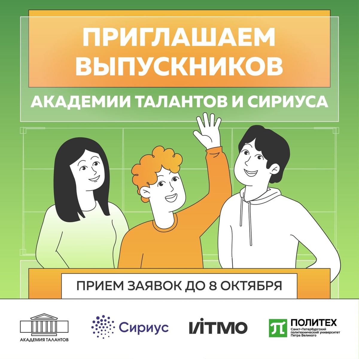 Мудрый в гору не пойдёт, мудрый в гору побежит! Потому что пришло время прокачать своё будущее! Если ты: 🔹 Выпускник Академии талантов или Сириуса 🔹 Учишься в 8-11 классе 🔹 Хочешь спланировать образовательный маршрут Выбирай дату и приходи! 🔬 14 октября, ИТМО – vk.cc/cPK9dE ▫️Мастер-классы: Атомно-силовая микроскопия, Роботизация химических технологий, VR/AR-технологии и экскурсия в лабораторию ▫️Лекция: Введение в инфохимию ⚙️ 15 октября, СПбПУ – vk.cc/cPKalr ▫️Лекция: Технологии цифровой промышленности ▫️Участие в нетворкинге и мастер-классах Центра дополнительного образования Передовой инженерной школы «Цифровой инжиниринг» СПбПУ 📬 Приём заявок до 8 октября. Не забудь прикрепить мотивационное письмо. Начало в 10:30. Участие бесплатное.