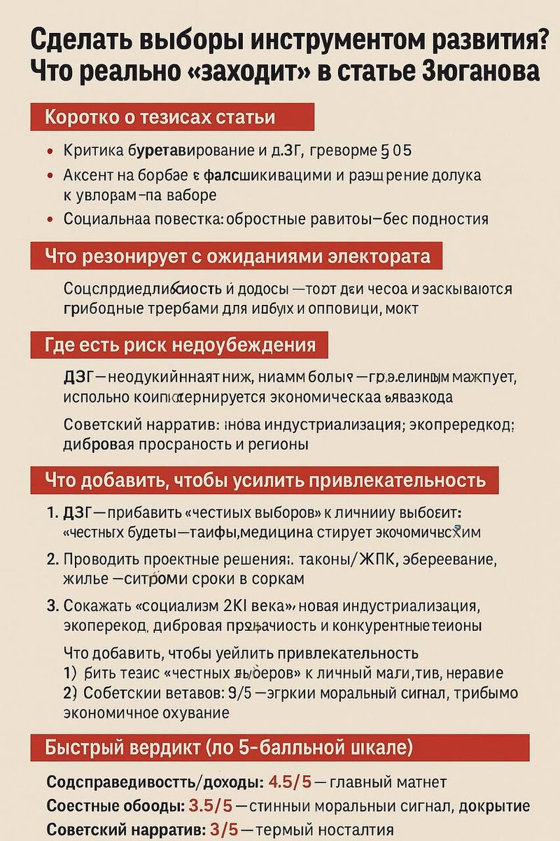 Сделать выборы инструментом развития? Что реально «заходит» в статье Зюганова Оригинал: kprf.ru — «Сделать выборы инструментом развития и сплочения, а не разложения общества!» (29.09.2025). (kprf.ru) Коротко о тезисах статьи — Критика многодневного голосования и ДЭГ, требование вернуться к однодневным очным выборам на бумаге. (kprf.ru) — Акцент на борьбе с фальсификациями и расширение допуска к выборам. (kprf.ru) — Социальная повестка: «бюджет развития», поддержка отраслей, справедливость, опора на советский опыт. (kprf.ru) Что резонирует с ожиданиями электората • Соцсправедливость и доходы. Рост цен и уровень жизни остаются главными тревогами россиян — эта часть повестки востребована широкой аудиторией. (levada.ru) • Запрос на понятные правила. Тема «честных выборов» морально сильна и понятна, особенно активным горожанам и наблюдателям. (Контекст: по данным ВЦИОМ, знание о ДЭГ высокое, и немалая часть поддерживает расширение онлайн-голосования, что усложняет прямую антириторику к ДЭГ.