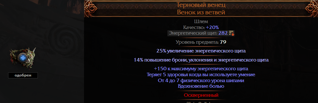 Терновый венец. Несмотря на то, что у шлема нет высоких элементальных сопротивлений и целых 2 крайне неприятных дебафа - я считаю его лучшим шлемом. Энергетический щит на данный момент для большинства классов самая проста я для разгона выживаемости механика. Проблему с расходом здоровья вы можете легко решить покупкой предмета на регенерацию здоровья.