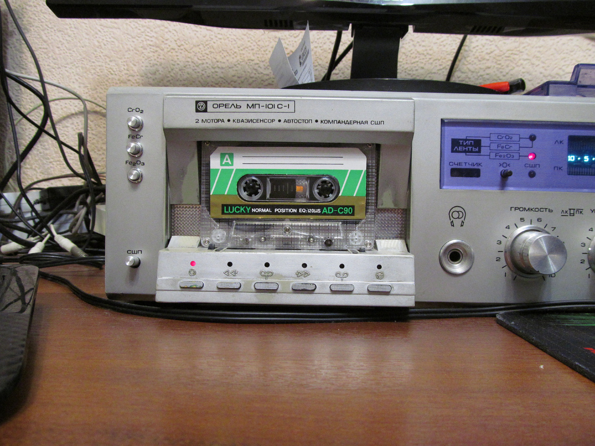 После записи кассета была вновь установлена в аппарат и произведен захват аудиосигнала звуковой картой с магнитной ленты. Были оцифрованы несколько песен с аудиокассеты Lucky AD90.