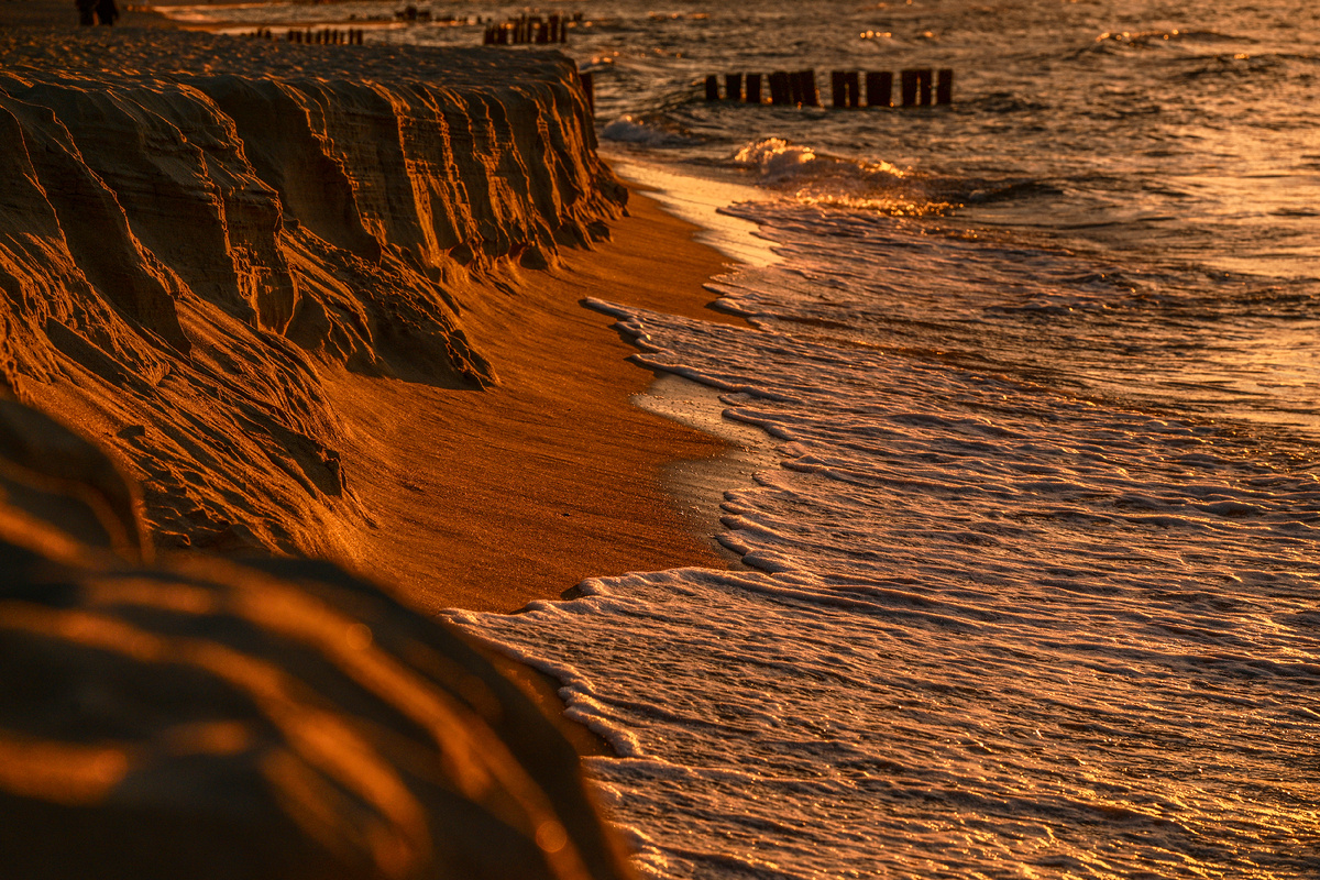 Сегодня в программе «Марсианские хроники» очередная фотопрогулка по побережью Балтийского моря где-то в окрестностях Зеленоградска. Баланс белого на фотокамере был выставлен в автомат для естественного освещения, но рыжая бестия по имени Солнце умудрилась обмануть автоматику камеры и устроить для меня красно-желтые дни, прямо как из песни Виктора Цоя. Впрочем, согласитесь, подмытый волнами песок в закатном свете кажется каким-то инопланетным. Глаза видели совсем другую картинку, но камера сделала все по своему, а я был не против. Почему бы и нет?! Так тоже хорошо. Закат сегодня здорово пошутил над романтически настроенными парочками и просто пришедшими проводить солнце за горизонт. Солнце показалось из-за облаков минут на двадцать, а потом снова скрылось в облаках и больше уже не выглянуло, оставив ожидавших закат без заката. Ну, такая тавтология. Скоро надо лететь в Москву по делам и некоторое время Балтика будет далеко. Думаю, что скучать начну уже на второй день, хотя и так живу зде