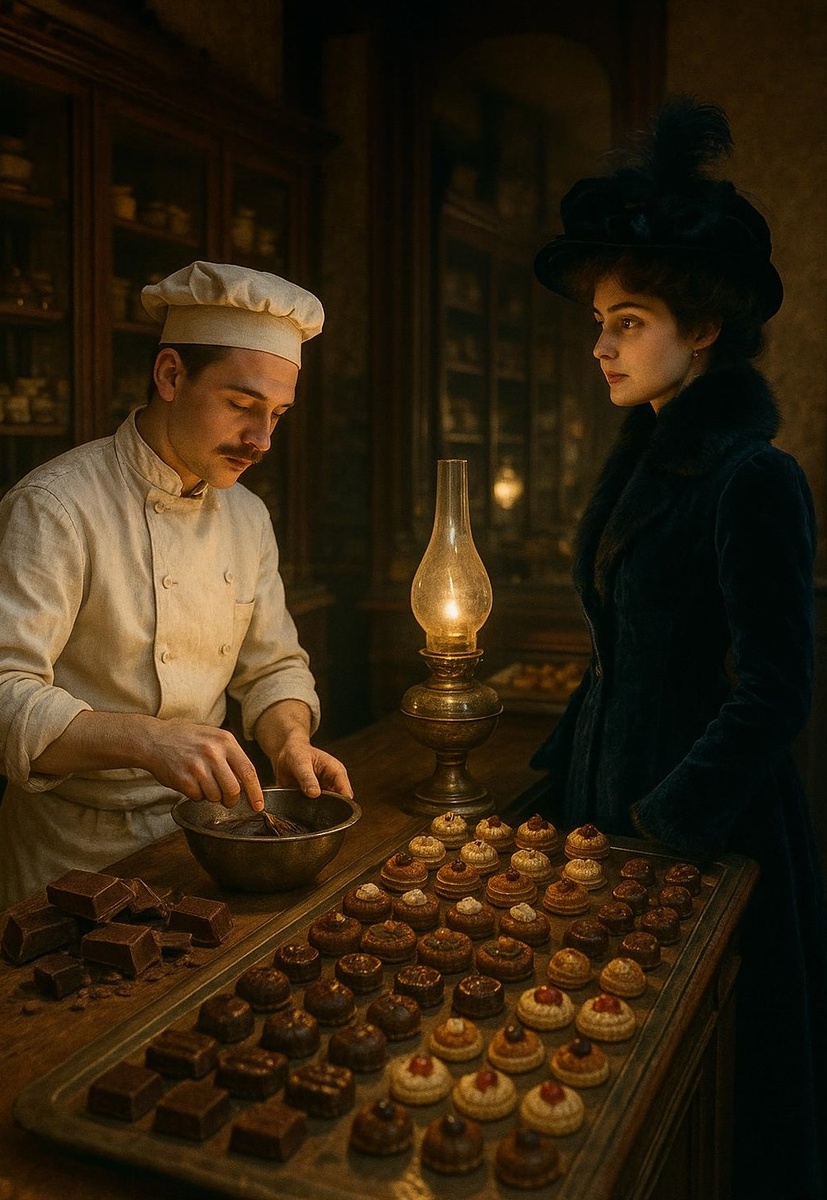 Было то в студёную декабрьскую пору тысяча восемьсот девяносто пятого года от Рождества Христова, когда над древним Парижем вились белые хороводы снежинок, словно ангелы спустились с небес, дабы украсить град сей к грядущему празднику. На холме Монмартр, где ветряные мельницы дремали под снежными шапками, а газовые фонари зажигались один за другим, словно земные звёзды, стояла небольшая кондитерская лавка мсье Луи Дюфура. Был сей мастер человеком искусным и трудолюбивым, хотя и не ведал он того, что судьба готовит ему место в анналах кулинарного искусства. В тот вечер, когда мороз рисовал на окнах ледяные узоры неведомой красоты, а в печи потрескивали дрова, Луи трудился над созданием шоколадных конфет для рождественских празднеств. Огонь в очаге плясал весело, отбрасывая золотые блики на медные котелки, в коих томились сливки, густые и ароматные, словно само благословение природы. А в другом сосуде плавился шоколад - тёмный, благородный, привезённый из дальних стран через моря и океан