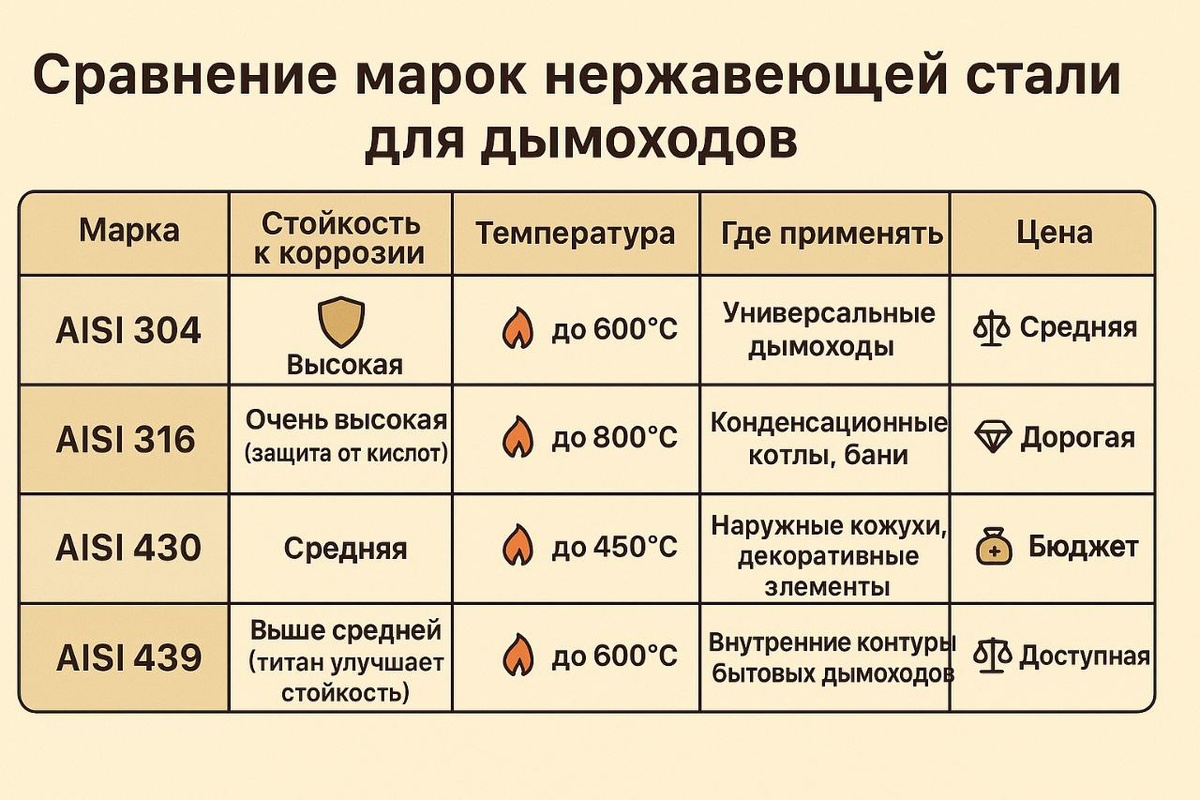 При выборе дымохода важно учитывать не только диаметр и утепление, но и марку нержавейки, из которой он сделан. Ведь именно сталь отвечает за долговечность и безопасность всей системы. Разберёмся, чем отличаются самые популярные варианты:
