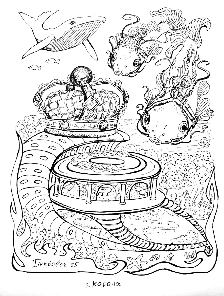 📒🖊#Inktoberdzen В начале была мысль нарисовать подводную королеву (которая возможно плетет что то.... и объединить по смыслу пару тем вместе), после мысль перешла к более оригинальной версии - постамент в виде короны. Был даже вариант ванны в виде короны... но если сделать ее вычурной с высокими шпилями, то купаться будет не удобно. И так постепенно я пришла к зданиям, чему то монументальному. Исследовала вопрос, пересмотрела фото затонувших сооружений, подводных музеев, и наконец макеты подводных апартаментов. В последнем нашлось мое вдохновение для этой работы. После того, как был найден основной объект стали появляться детали. Хотелось сделать это здание богато украшенным (тема 17 дня), добавить деталей типа морской звезды (тема 7 дня).