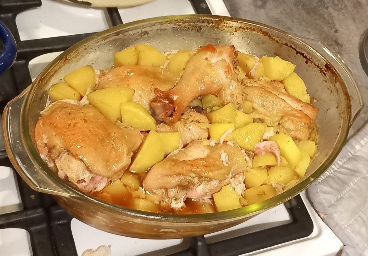 #курица #маринад Я уже неоднократно рассказывала о мясном ларьке на нашем рынке, где ребята из Пензенской области торгуют мясом и птицей из тамошних деревенских и фермерских хозяйств. Последнее время я пристрастилась покупать у них деревенских бройлеров, которые весят 2-2,5 кг. Поэтому хватает и на бульон, и на запекание. В бульон идут спинка, шея, крылья и ребра с частью грудки, поэтому он получается наваристым, но не особо жирным. Борщ на таком бульоне очень оценили и муж, и внук. А вот мясные кусочки - грудку, голень и бедра - я мариную 2-3 суток в соевом маринаде и запекаю в духовке вместе с маринадом. В этот раз я решила сделать не просто курицу, а с картошкой. Картошку нарезала некрупными кусочками, положила нижним слоем на смазанное растительным маслом дно формы, сверху положила кусочки курицы, залила маринадом, закрыла крышкой и поставила в духовку, нагретую до 180-200 °С. Таймер не ставила, но запеклось все это меньше, чем за час, причём картошка буквально тает во рту. Прият