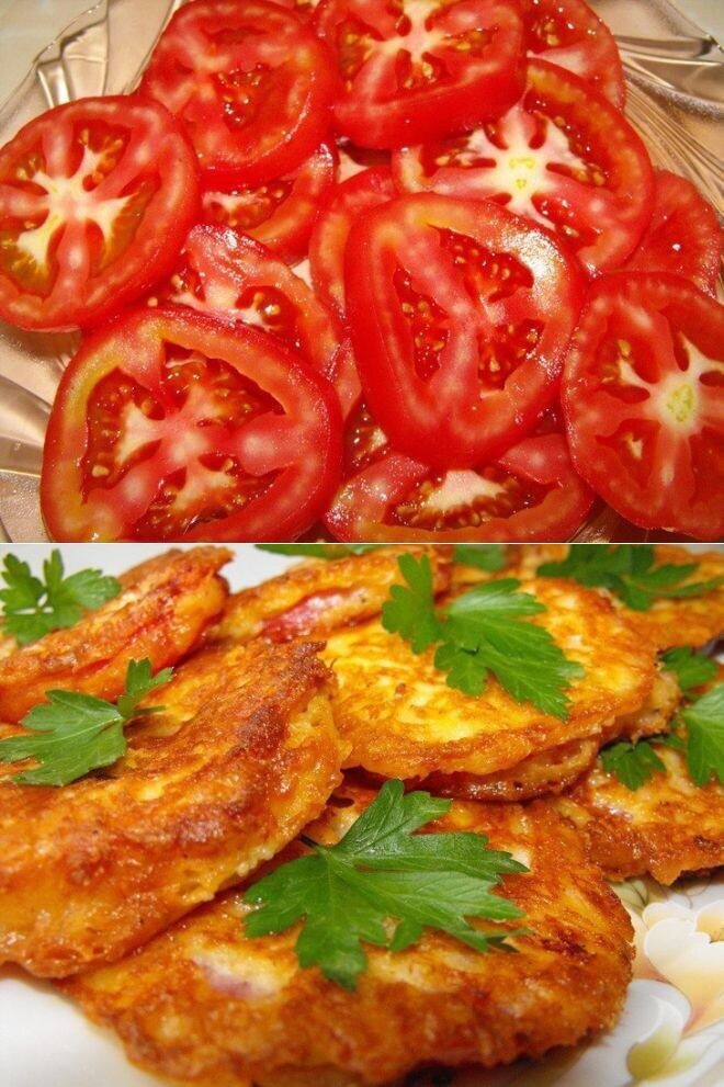 Ингредиенты: -3 средних помидора -150 гр твердого сыра -2 яйца -2 ст.л. майонеза или сметаны -1-2 ст.л. муки -соль, перец по вкусу -растительное масло для жарки -петрушка для украшения Приготовление: Помидоры помыть, обдать кипятком, снять кожицу и нарезать кружочками. Сыр натереть на мелкой терке. Сделать кляр: к сыру добавить яйца, майонез, муку. Посолить, поперчить по вкусу и перемешать. Консистенция дожна получиться густой. Помидоры обмакнуть в кляр, выложить ложкой в сковороду, разогретую с растительным маслом. Обжарить с двух сторон до золотистой корочки. Выложить на бумажное полотенце, дать стечь лишней жидкости. При подаче украсить зеленью петрушки. Приятного аппетита! Не забудьте подписаться!