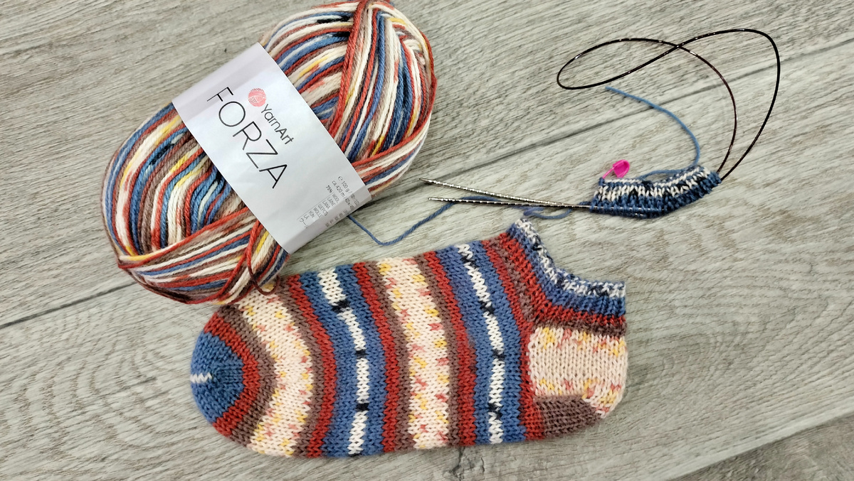 Как-то ещё давно я прикупила моточек "Форзы" носочной, но всё дело не доходило до нее.. А тут похолодало, и руки сами запросили спицы😁 В общем пряжа YarnArt Forza, метраж 420м/100гр, цвет 2515 (для меня эта расцветка что-то типа "Осень на море"☺️). Спицы взяла 2,25. Набрала 56 петель (чаще всего я конечно набираю 60, но эта пряжа мне показалась чуток толще и пухлее, чем привычная мне Alize Superwash Artisan, хотя метраж у них одинаковый). Ну и вчера вечером, под сериал, родился один коротенький носочек, кстати вес его всего 16 грамм. Пяточку я не укрепляла (обычная бабушкина), клин подъёма тоже не делала.. Короче упрощённые носочки для ношения дома вместо тапочек😁 Следующую пару уже буду делать по всем правилам, чтоб в обувь можно было носить😁 Так же вечером постирала и надела его на блокатор, а утром он уже высох (благо батареи работают😄) Носочек распушился и стал мягче.. Хочу ещё про блокатор сказать.. Муж мне его вырезал из куска пластика, который продают в строительных магази