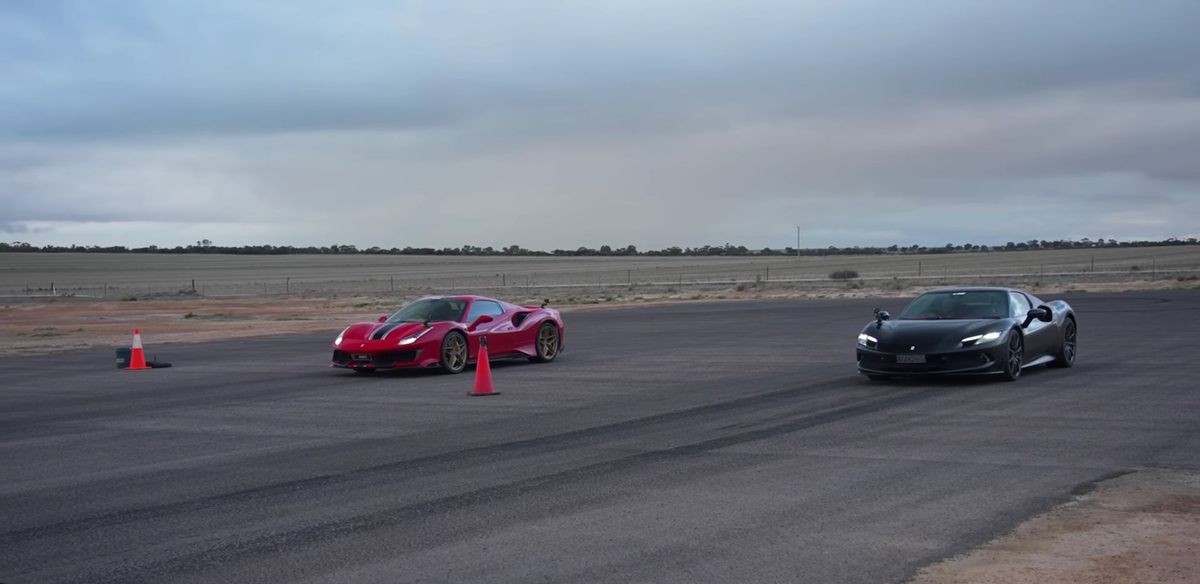Сравнение гибридного Ferrari 296 GTB и редкой 488 Pista на дрэг-рейсе – кто быстрее