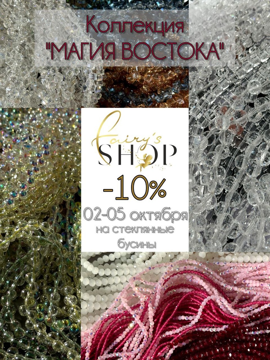 ⚡️✨-10% на новую коллекцию стеклянных бусин «Магия Востока» от FAIRY’S SHOP✨⚡️ ❤️🔥Только со 2 по 5 октября действует специальная цена на новую роскошную коллекцию стеклянных бусин, которую Фея Татьяна показала в своем обзоре: https://t.me/FairySHOPretail/3287 Акция действует на сайте и в шоу-руме 💎 Роскошный выбор форм – от хитовых капель с огранкой бриолет до абсолютно фантазийнфх фриформ 💎Невероятная цветовая палитра –от базовых чистых цветов до самых невероятных нюдово-пудровых оттенков! И конечно, вся палитра трендовых коричнево-золотых 💎 Самые востребованные покрытия и эффекты – от прозрачных до загадочных люстровых 💎 Только фабричное производство – прекрасное качество отлива и стойкость покрытий 💎 Широченная размерная линейка А тем, кто внимательно смотрят наши ролики и отправляют ❤️ мы приготовили дополнительную скидку (промокод спрятан в ролике), которая будет активирована при сборке заказа🎁 👉🏻Приобрести стеклянные бусины со скидкой -10% можно: 🛍На сайте: http
