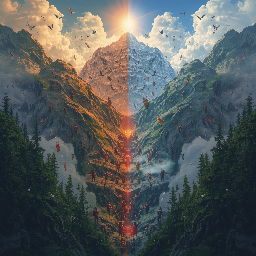 Горы Эхо встретили команду странной какофонией звуков. Мир был разделён на три зоны, каждая из которых имела свою уникальную звуковую характеристику. Слева гремела музыка — Певцы создавали мелодии такой силы, что горы буквально резонировали с их голосами. Справа царила абсолютная тишина — Молчальники жили в мире без единого звука. А в центре располагалась зона Слушателей, где люди напряжённо вслушивались в каждый шорох, каждое эхо.
