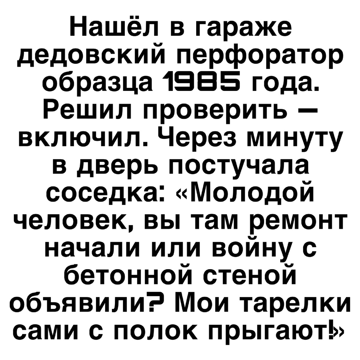 Нашёл в гараже дедовский перфоратор образца 1985 года. Решил проверить — включил. Через минуту в дверь постучала соседка: «Молодой человек, вы там ремонт начали или войну с бетонной стеной объявили? Мои тарелки сами с полок прыгают!»