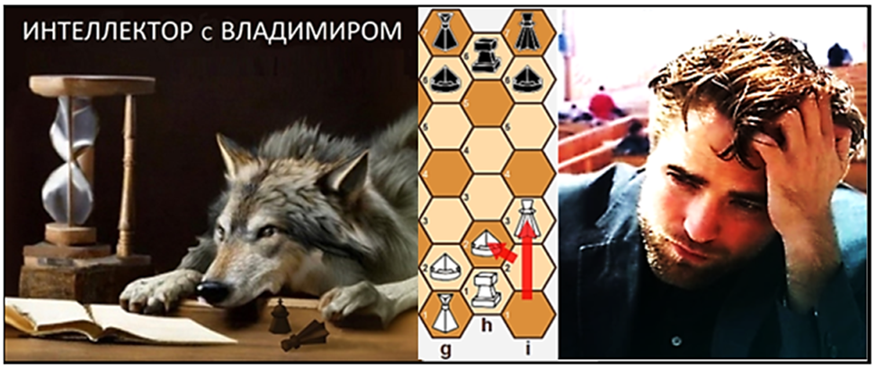 3) 1. i2~h2 Lh5 3. Di3 Ad5 (1) 5. c2~b2 g5 7. Lb3 Li5 9. Dh3 g4 (3).