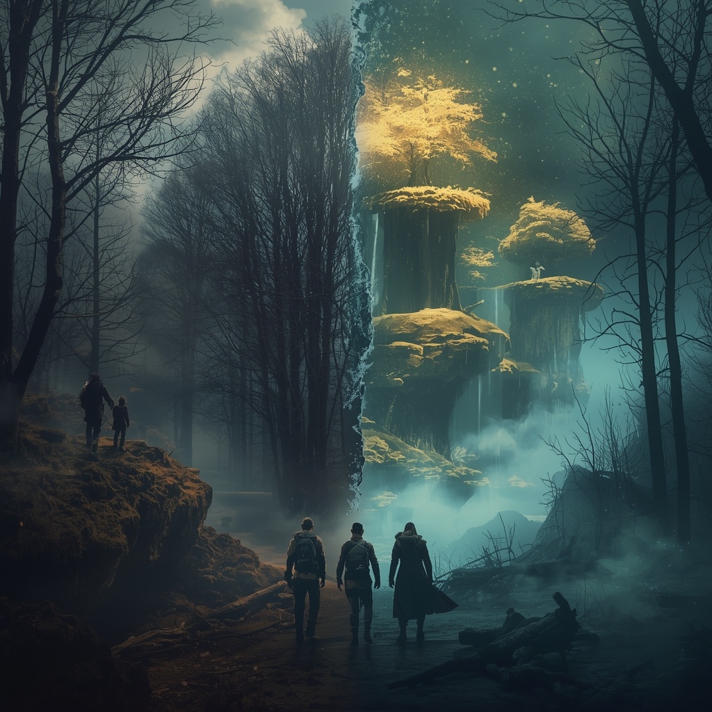 Леса Забытых Снов встретили команду странным зрелищем — природа здесь была буквально разделена пополам. Слева простирался обычный лес с чёткими контурами деревьев, каменистыми тропами и серым небом. Справа же раскинулся мир, словно сошедший со страниц сказки — светящиеся деревья парили в воздухе, разноцветные облака дрейфовали между ветвями, а сами краски были настолько яркими, что казались нереальными.