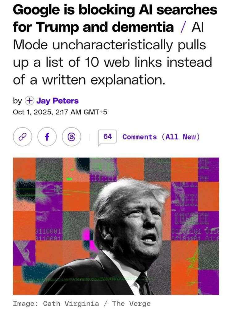 В начале октября 2025 года стало известно, что компания Google ввела избирательные ограничения для своей системы искусственного интеллекта в поиске, заблокировав формирование ИИ-ответов на запросы о психическом здоровье Дональда Трампа.