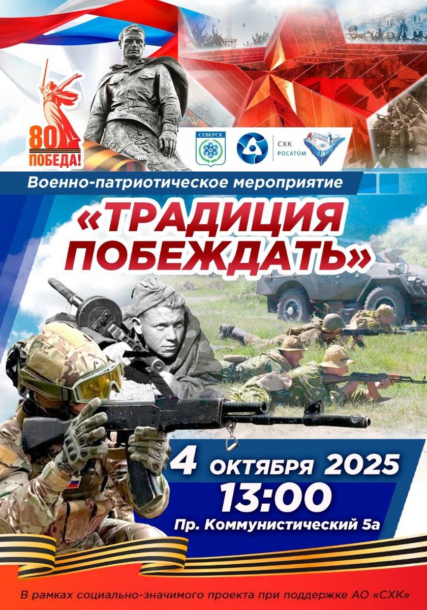 Всех, кто готов проверить свои силу, ловкость и командный дух, приглашаем на военно-патриотическое мероприятие «Традиция побеждать». Что вас ждет? - мастер-классы по тактике ведения боя и оказанию первой медицинской помощи в полевых условиях; - военизированная полоса препятствий; - стрельба по мишеням из автомата Калашникова. Это уникальный шанс не только проверить свои физические возможности, но и получить ценные навыки, зарядиться духом победителей и провести день с пользой.