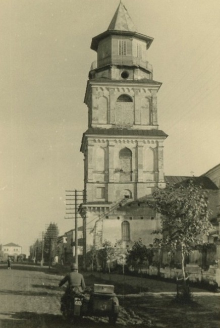 Фотография от 8 августа 1942 года, город Севск, Успенский Собор во время фашистской оккупации. До наших дней сохранилась только колокольня Успенского Собора. В августе 2000 г. архиепископ Брянский и Севский Мелхиседек освятил в первом ярусе колокольни часовню в честь Успения Пресвятой Богородицы. Фото 4