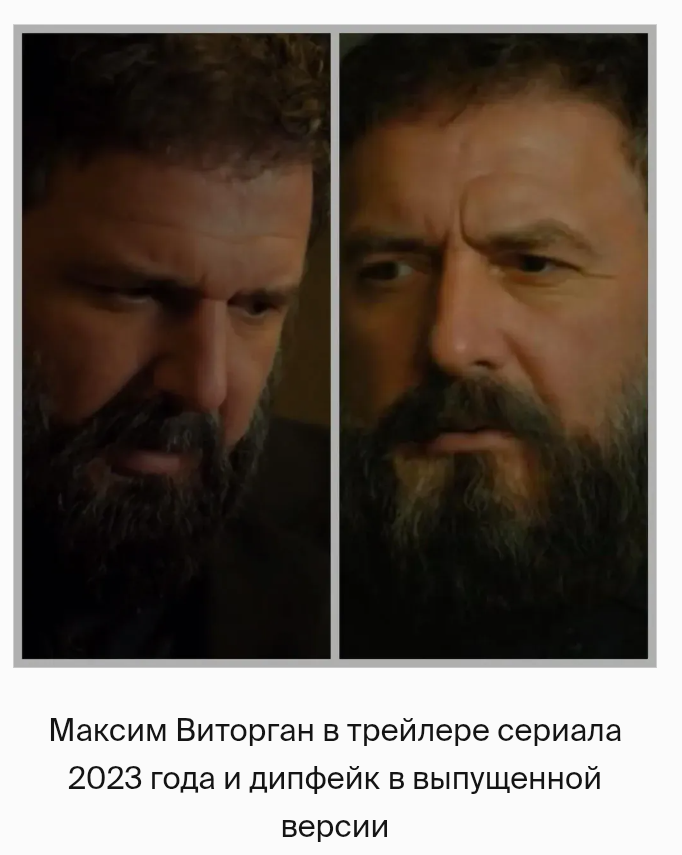 Это о дипфейках. Сначала об известном актёре. А потом чисто личная история, потрясшая нашу семью. Небывалая история и скандал случилась в кино. На премьере картины "Бар. Последний звонок" знатоки заметили, что заявленный в кастинге актёр Максим Виторган, на экране так и не появился. Персонаж его есть, конечно. Убрать эту линию невозможно, а значит и вырезать. Священник, потерявший дочь. Максима Виторгана, который публично выступил против спецоперации России в Украине, заменили на дипфейк, созданный нейросетью, а имя убрали из титров. Голос тоже изменён. Вроде похож, а вроде и нет К слову сказать, это уже не первый случай. В двух картинах Виторгана совсем вырезали. А в фильме "Контакт" тоже заменили дипфейком. Сам Виторган отреагировал так "Ну что ж, вышла моя вторая киноработа с изменённым лицом. Это уже фильмография, как-никак. Похоже, во втором случае работа выполнена тоньше, но всё-таки чувствуется какое-то внутреннее сопротивление исполнителей. Ребят, не переживайте,