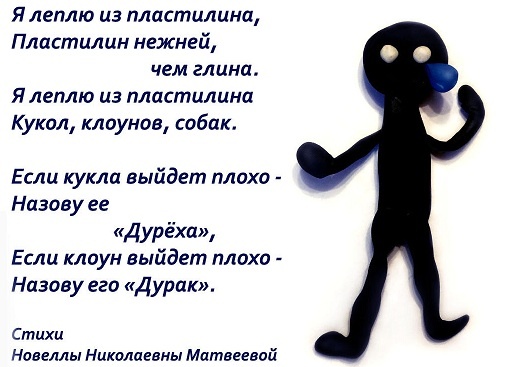 «Я леплю из пластилина. Пластилин нежней, чем глина. Я леплю из пластилина Кукол, клоунов, собак. Если кукла выйдет плохо, Назову её Дурёха, Если клоун выйдет плохо, Назову его Дурак. Подошли ко мне два брата, Подошли и говорят: Разве кукла виновата, Разве клоун виноват? Ты их лепишь грубовато, Ты их любишь маловато, Ты сама и виновата, А никто не виноват. Я леплю из пластилина, А сама вздыхаю тяжко. Я леплю из пластилина, Приговариваю так: Если кукла выйдет плохо, Назову её Бедняжка, Если клоун выйдет плохо, Назову его Бедняк».