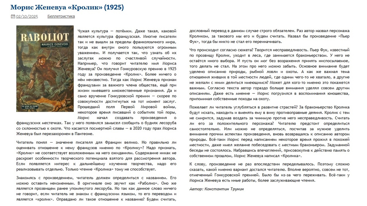 Морис Женевуа «Кролик» Критика