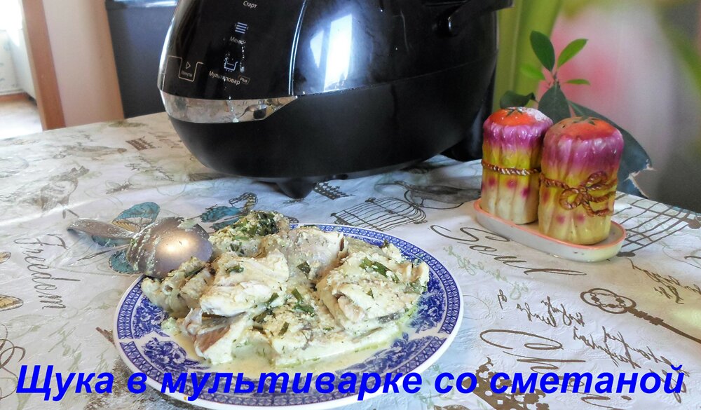 Щука в сметане приготовленная в мультиварке. Зубастая хищница, пресноводная красавица щука фактически является царицей наших озер и рек . Щука в старые времена считалась царской рыбой, да и сейчас в наше время пользуется огромным спросом. Мясо щуки ни когда не бывает жирным и если его правильно приготовить , получится нежным и приятным на вкус. Сейчас я поделюсь с вами одним из таких рецептов и мультиварка нам в этом поможет. Для рецепта нам понадобится. Щука потрошеная и разделанная на куски – примерно килограмм. Масло растительное 2 -3 ложки.. Сметана – 100-150 грамм Луковица – одна штука. лаврушка – 3 шт.; Соль – по вкусу. Карри – одна чайная ложка. перец черный горошек – 6-7 горошин. Способ приготовления. - И так, щуку чистим от чешуи , потрошим и острым ножом вырезаем голову , плавники и хвост. Они нам ещё пригодятся для ухи. - Тушку нарезаем на порционные кусочки шириной примерно по 2 – 3 сантиметра и промоем под краном. - Стейки из щуки выкладываем в чашку и солим но не очень