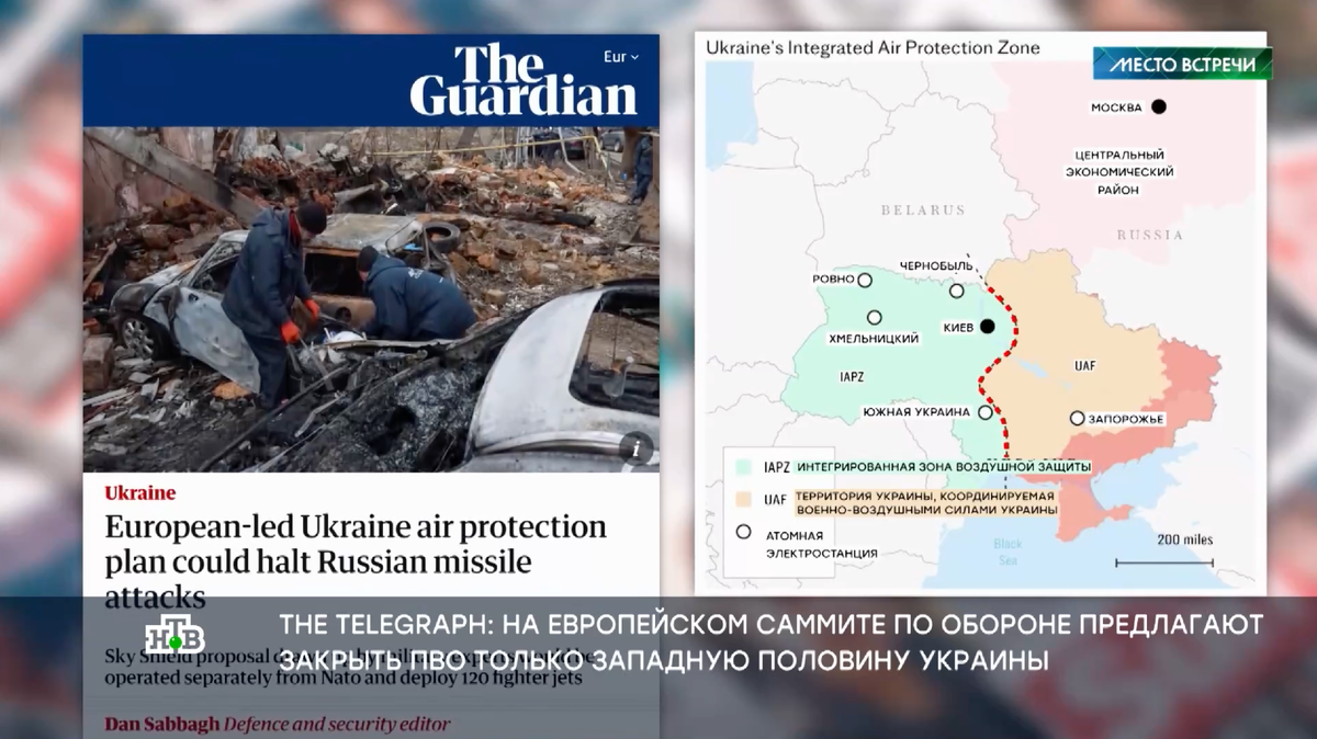 Британские СМИ обнародовали план Европы по «защите украинского неба». Предполагается, что европейцы закроют с помощью ПВО западную часть Украины и Киев — якобы для обеспечения безопасности важнейших объектов энергетической инфраструктуры. The Guardian пишет, что такая схема безопаснее возможной отправки западных войск на территорию Украины, поскольку снижает риск прямого столкновения НАТО с Россией. Этот европейский план обсудили и в студии «Места встречи». Эксперт считает, что наши военные полностью готовы сбивать натовские самолеты, и привел цитату одного из российских офицеров: