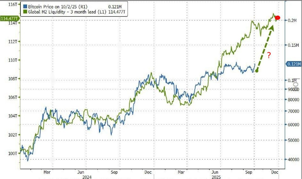 Обновление по динамике изменения глобальной ликвидности M2 и курсу BTC: положительная корреляция сохраняется - BTC следует за глобальной