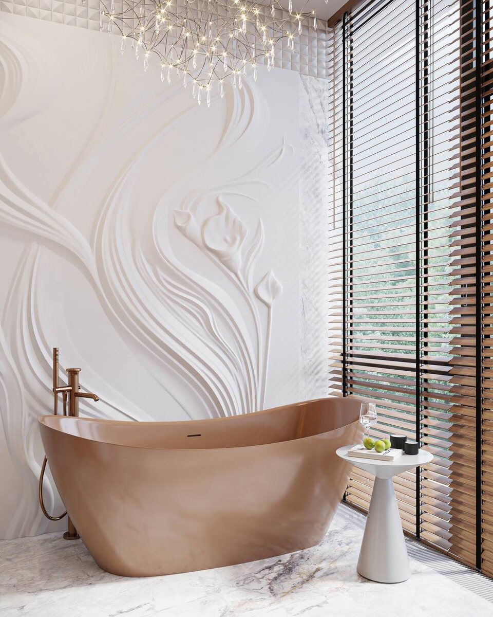 Этот санузел мы отправляли на конкурс Salini - именно их сантехника стоит в проекте. Очень хотелось занять призовое место, до последнего верила в нас, но в этот раз не повезло. Но, считаю, что ванная все равно достойна вашей любви и оваций. Потрясающая ведь, да? Карамельного цвета ванна на фоне гипсового рельефа. Светильник, который мерцает как россыпь драгоценных камней. Раковины, смесители, какой-то дикой красоты плитка. Считаю, здесь прекрасно все. Так что, не поскупитесь на сердечки-огоньки 🔥