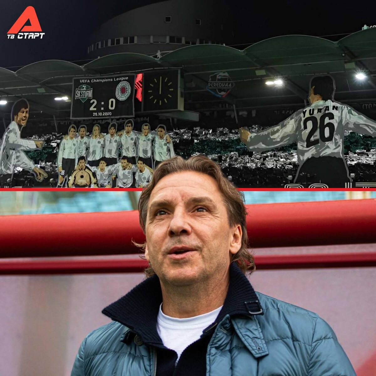 🤯 Юран — главный герой перформанса фанатов «Штурма» Перед игрой с «Рейнджерс» болельщики австрийцев показали огромный баннер, посвященный бывшему российскому нападающему, а ныне тренеру Сергею Юрану. Так они вспомнили еврокубковую победу над шотландцами из 2000 года (Сергей забил в том матче) и хотели призвать повторить результат. И это у них получилось — «Штурм» выиграл у «Рейнджерса» со счетом 2:1 👊🏻 Подписывайся на ТВ СТАРТ в MAX📲