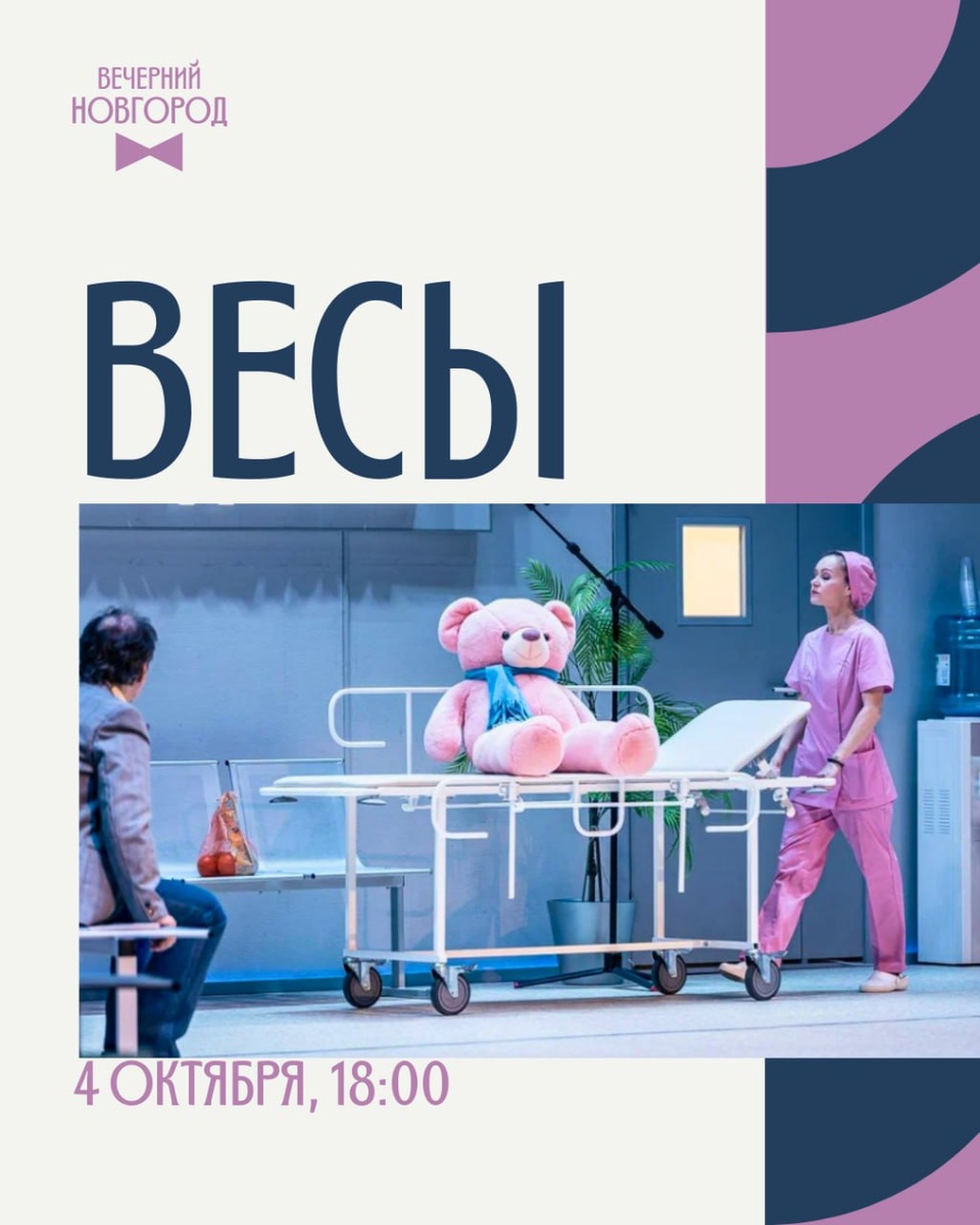 🤵 Комедия Евгения Гришковца «Весы» в Великом Новгороде О чём говорят мужчины в самые откровенные моменты жизни? О доме, семье и, конечно, о своих чувствах. В роддоме встречаются четверо мужчин: одни с богатым жизненным опытом, другие совсем молоды. Но их объединяет одно — ожидание чуда рождения. Эта пьеса, полная искренности и юмора, помогает по-новому взглянуть на привычные вещи. 🗓 4 октября, 18:00 📍 Филармония им. Аренского 🎟 Билеты можно купить тут