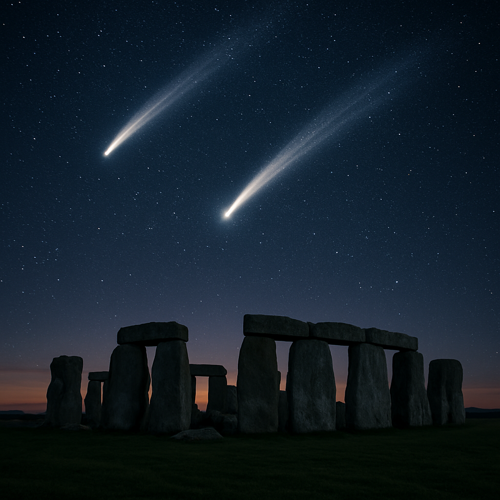 Наблюдатели в Великобритании стали свидетелями события, которое уже называют уникальным. В ночь накануне сразу две кометы — C/2025 R2 (SWAN) и C/2025 A6 (Lemmon) — оказались видимыми невооружённым глазом и прошли над одним из самых загадочных памятников мировой истории, Стоунхенджем. Снимки, сделанные очевидцами, показывают, как над каменными глыбами простираются два светящихся хвоста, а само небо озаряется редким сиянием. Астрономы подтверждают, что речь идёт о редчайшем совпадении. Яркие кометы сами по себе становятся событием, которое обсуждают во всём мире. Но чтобы сразу два объекта появились на небосклоне одновременно — это явление почти невероятное. И особенно символично, что наблюдать его удалось именно над Стоунхенджем — памятником, который часто связывают с астрономическими знаниями древности. По расчётам, обе кометы действительно оказались на небосводе в одной области неба, и их можно было различить без телескопа. SWAN выделялась более ярким и протяжённым хвостом, Lemmon был