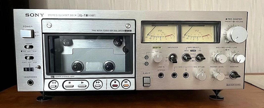 Модель EL-7 была выпущена в 1976 году как флагманская дека для нового формата. Это была машина высшего класса, о чём красноречиво говорила её конструкция: три мотора и три головки. Такая схема использовалась только в самых продвинутых и дорогих катушечных магнитофонах.