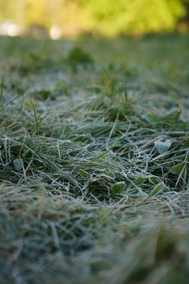 Ночью температура в некоторых районах города упала до 0°C: такой красивый иней заметили на газонах ✨