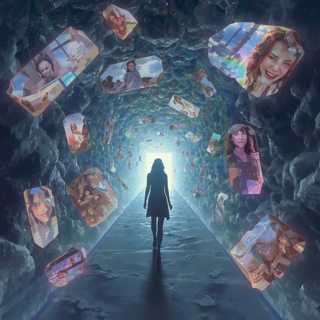 Решение пришло неожиданно. Элара поняла, что единственный способ понять природу заточения — самой войти в один из лабиринтов разума. — Это слишком опасно, — запротестовал Торан. — Что если ты тоже потеряешься там? — У меня есть преимущество, — ответила Элара, касаясь Изначального Источника. — Я связана с силой, которая объединяет все миры. Это должно помочь мне сохранить связь с реальностью. Кристалия выбрала один из ближайших лабиринтов — его обитателем был молодой философ по имени Логос, который первым начал эксперименты с самопознанием. — Помните, — предупредила она, — внутри лабиринта разума время течёт по-другому. Одна минута здесь может стать часами в его мыслях. Элара приложила руку к кристальной стене и почувствовала, как реальность начинает размываться. Мир вокруг неё растворился, и она оказалась в коридоре из чистого света, стены которого отражали не её облик, а бесконечные фрагменты чужих воспоминаний. Первое, что поразило её — абсолютная тишина. Здесь не было звуков внешнег