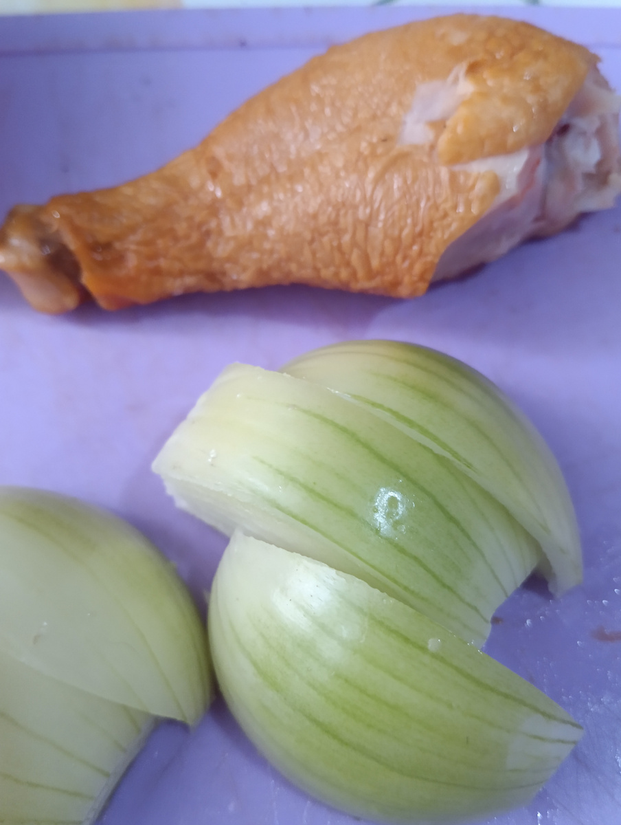 Сначала жарим лук с мясом, которое найдется в холодильнике.