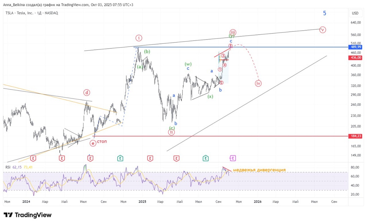 #TSLA В сентябре акции компании Тесла выросли на 30%. Росту цен способствовали покупки акций Маском на $1 млрд с целью получить бонус стоимостью в $1 трлн – эти покупки и их последствия на техническую картину разбирали на Открытом созвоне 18 сентября, а ранее на созвоне в начале сентября – 9 сентября. Инсайдерские покупки способствовали подтверждению сценария роста бумаги в восходящей КД, в волне [iii], которая почти завершилась. Поскольку вторая волна [ii] была глубокой, то достаточно лишь обновить верхи 18 декабря 2024 с тем, чтобы уйти в коррекцию [iv]. Стремительный рост акций Тесла поддерживали умеренный рост на американском рынке, но эта поддержка вскоре на время уйдет (коррекция на Тесле в волне [iv]). Вчера вышли данные о рекордных объемах мировых поставок машин Тесла в 3-м квартале 2025. Наиболее вероятно, что истечение срока действия федерального налогового кредита в размере $7500 в США, вероятно, подстегнуло продажи. Поскольку рынки «живут» ожиданиями, то рекордные про